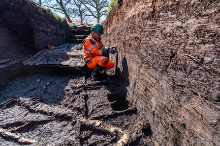 Project Supervisor Max Dampier working on a prehistoric wooden track at the Honeygar site in Somerset © Wessex Archaeology
