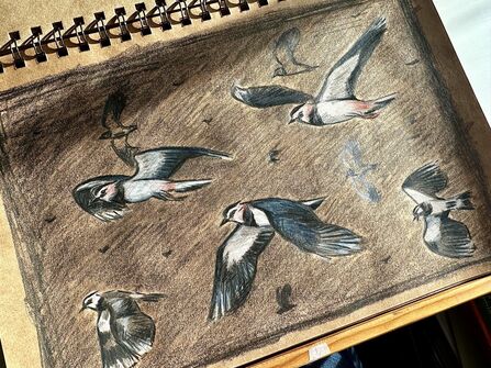 A sketchbook in a bird hide, featuring sketches of wetland birds including avocet and lapwing